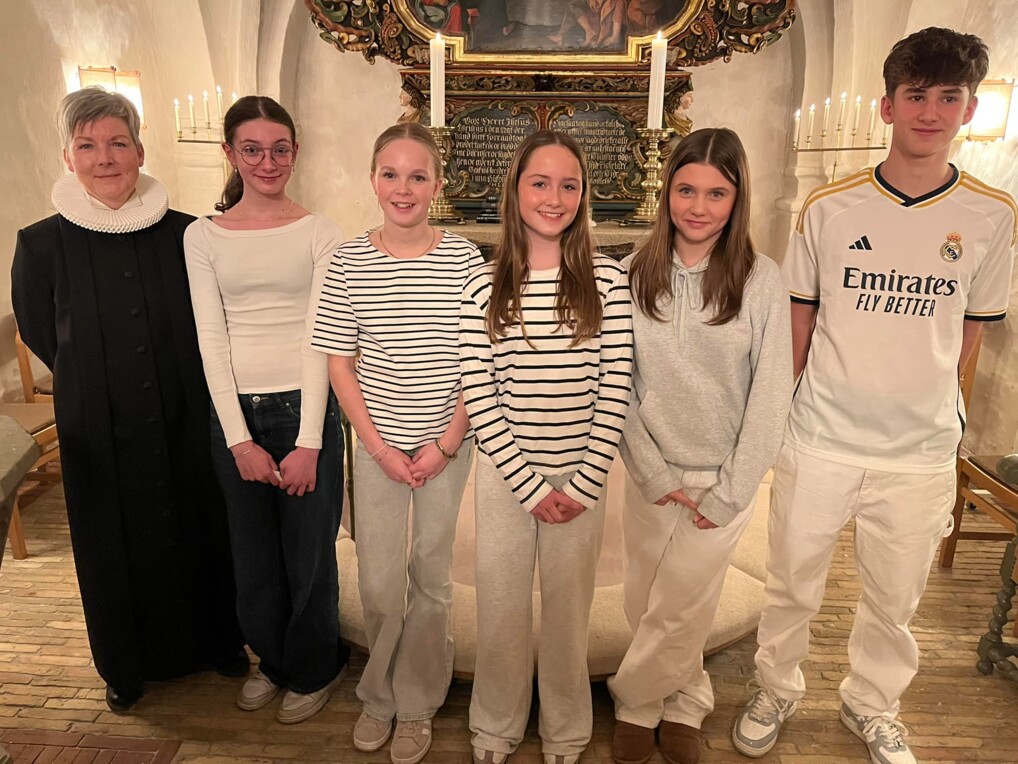 5 dåbskonfirmander sammen med præst Eva Graff Mikkelsen i Gørløse Kirke fra artiklen "Vi vil gerne være kristne!". Privatfoto