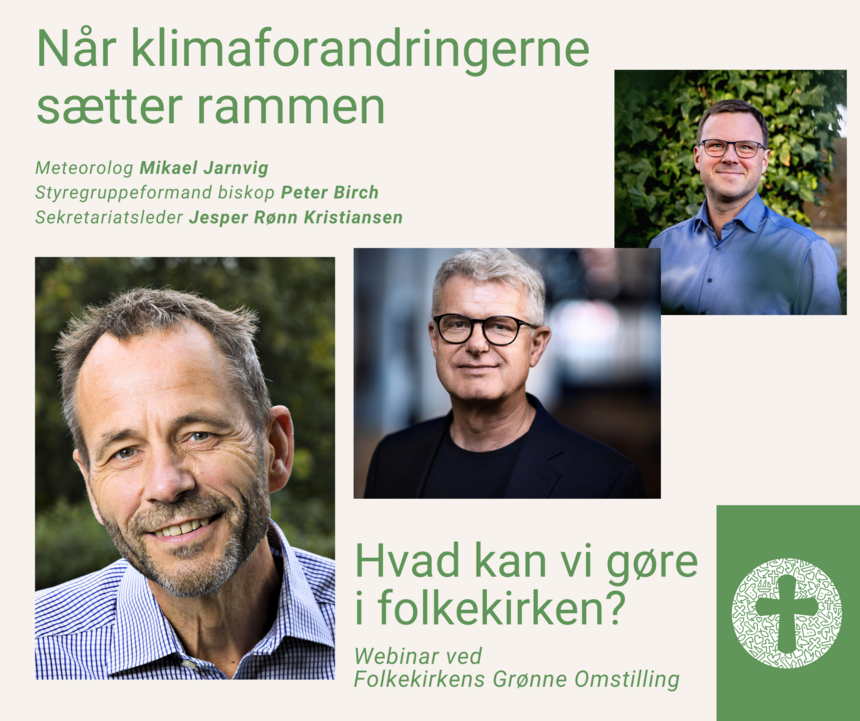 Torsdag den 26. marts klokken 16.30 til 17.30 afholder Folkekirkens Grønne Omstilling desuden et webinar, hvor Jesper Rønn Kristiansen i selskab med biskop og formand for Folkekirkens Grønne Omstilling, Peter Birch og meteorolog Mikael Jarnvig klæder menighedsråd på til at prioritere, planlægge og tage stilling til de grønne valg, de er stillet over for lokalt.