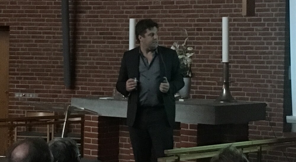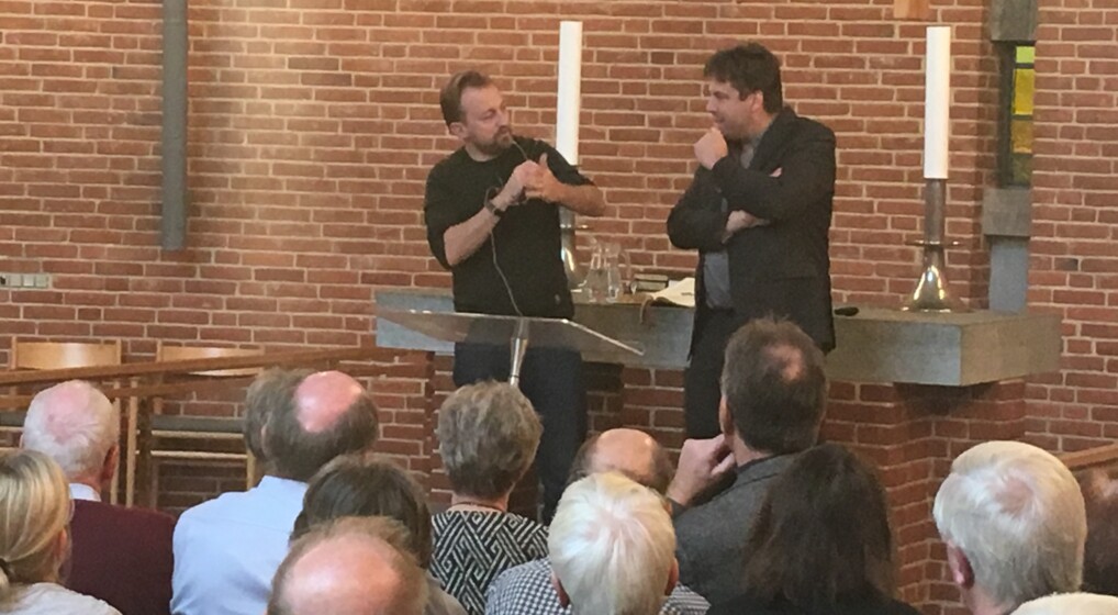 Thomas Gammeltoft-Hansen og Klaus Wivel talte om forfølgelsen af kristne i Mellemøsten til en næsten fyldt Østervangkirken i Glostrup. Foto: Anders Haubart Madsen