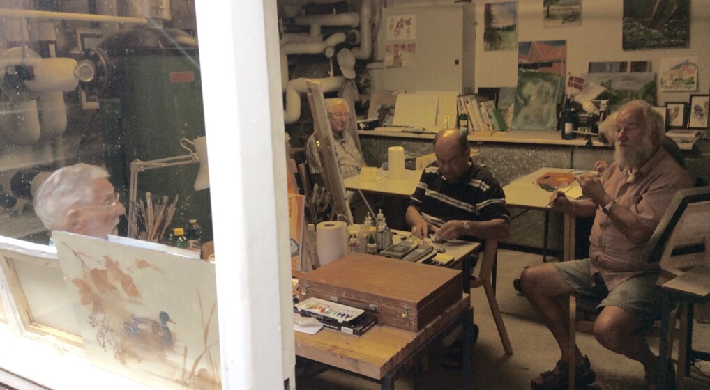 'Bihulen' i Risbjerg Kirke i Hvidovre er et fællesskab for mænd, der samler ældre herrer om akvarelmaling, hobbyarbejde og intellektuelle samtaler. Foto: Anders Haubart Madsen