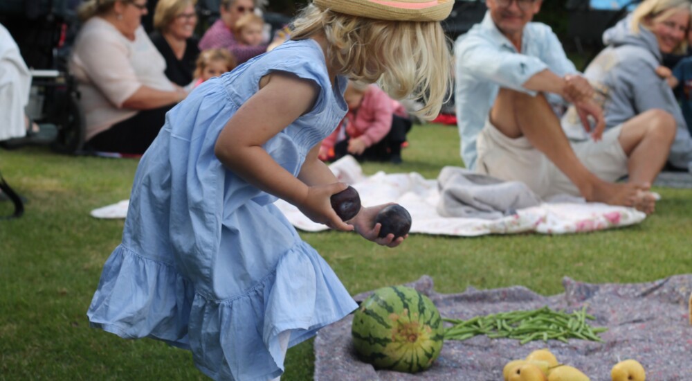 En masse frugt og grøntsager, et kæmpe brød og nogle store vandpistoler er anrettet på et tæppe på græsplanen.