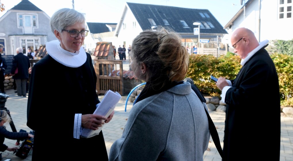 Sognepræst Ulla Skorstengaard i samtale med en journalist. (Foto: Sarah Auken)