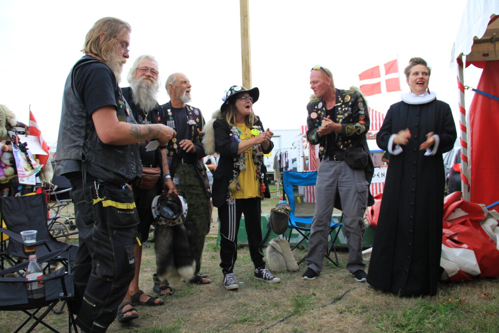 Det er der mange, der har. Omkring 50 mennesker sidder ved de lange borde inde i teltet, da hun lidt senere læser indgangsbønnen. Og mange sidder udenfor, heriblandt en gruppe landevejsriddere, der sidder i campingstole med deres cykler, barnevogne og hunde lige ved siden af åbningen ind til teltet.