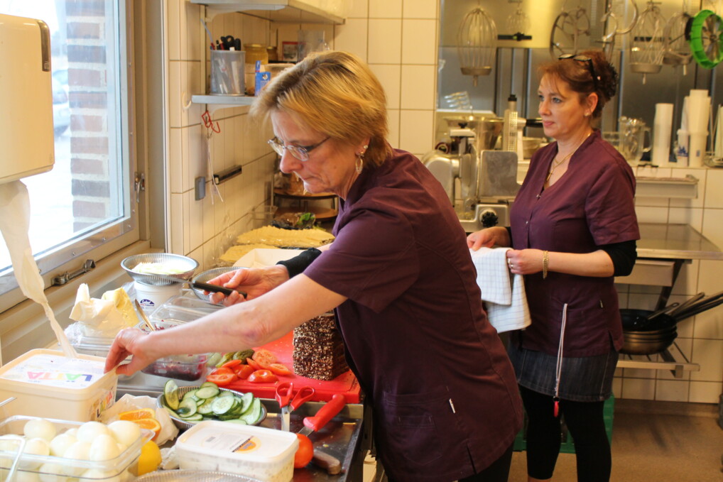 Anne Andersen og Roxana Chelu gør klar til dagens smørrebrød. Cafe Hjertetræet er en del af Avedøre Kirke og fungerer samtidig som aktiveringsprojekt for Hvidovre Kommune. (Foto: Rikke Strandgaard)