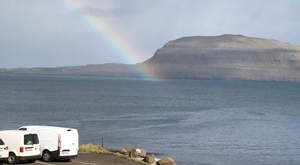 Nå, de stillingsopslag må vente til senere. Vi kunne lettede løsne sikkerhedsbælterne og fortsætte turen til Torshavn i to lejede minibusser med gode provstekolleger som sikre chauffører. Vejrudsigten var mildest talt ikke god, og mange har oplevet at besøge Færøerne uden at se ret meget af den smukke og barske natur, men solen skinnede og gav os et køligt, men smukt første indtryk. Solglitrende hav, stejle fjeldsider, dramatiske skyformationer, og næppe var vi ankommet til hotellet med udsigt til Nólsoy (provst Søren Nolsøe, der er færøsk gift, var en af de tre tilrettelæggere), før solen med regndråbernes hjælp dannede den smukkeste regnbue i havet – så nu ved vi alle, hvor guldet ligger begravet! I øvrigt saboterede vejret alle dystre prognoser og viste os alle seks dage en solbeskinnet færøsk natur – kun afbrudt af hidsige hagl- og snebyger og en chillfaktor omkring frysepunktet, så vintertøjet var ikke medbragt forgæves.