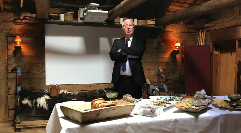 Jóannes er 17. generation af slægten Patursson, der har boet på Kongsbondegården, siden den i 1557 overgik fra at være bispesæde. Efter gudstjenesten fortalte han om kirkens historie, og derefter var han vært i Roykstuvan (Rygestuen), det gamle samlingsrum med åbent ildsted på gulvet og røghul i loftet. På traditionel vis indledtes måltiden med Lívsinsvatn skænket i drikkehorn, inden vi blev budt på grind, spæk, tørret fisk, fårerullepølse og meget mere – personligt har jeg så smagt spæk for første og sidste gang!