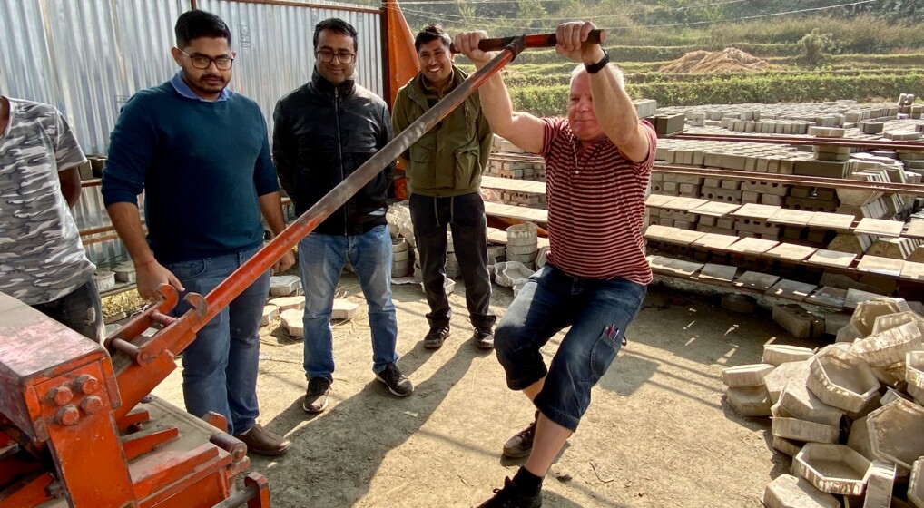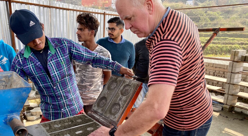 Kurt bliver den første prøvekanin i den nepalesiske byggebranche. Han skovler grusblandingen op i tragten, som så bliver presset ned i formen. Og derefter skal hele kroppen i sving. Alle kræfter bliver brugt på at stemple sand, grus og cementblanding sammen.