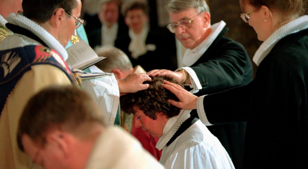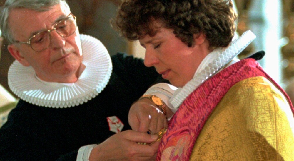 1995. Tidligere domprovst Per Rysgård Jensen hjælper Lise-Lotte Rebel i bispekåben. Foto: Keld Navntoft/Scanpix Ritzau