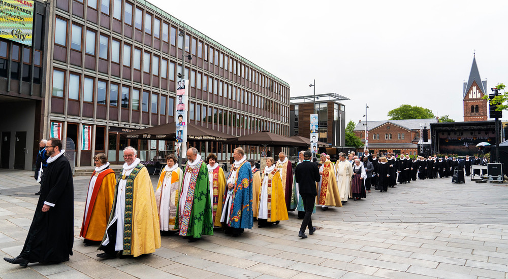 Biskopperne, der her ses i procession ved Himmelske Dage i Herning i foråret 2019, sender en hilsen til menighederne