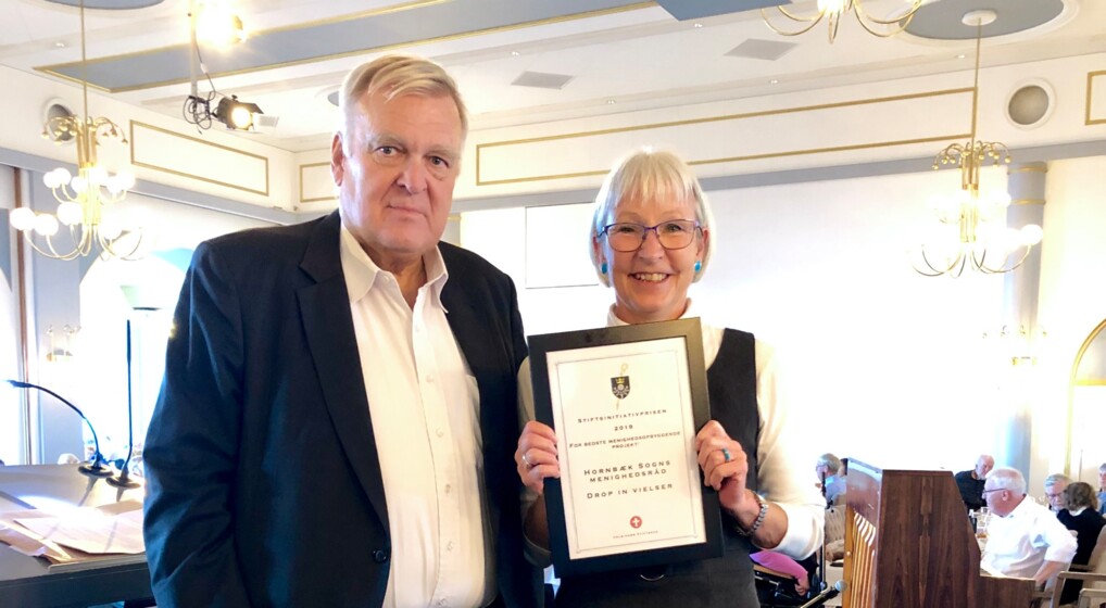 Her modtager Bodil Olesen prisen fra Stiftsrådets formand Søren Ødum i 2019 på vegne af Hornbæk Kirke, der fik den for at invitere til drop in-vielser i forbindelse med kulturnatten i byen. (Foto: Sarah Auken)