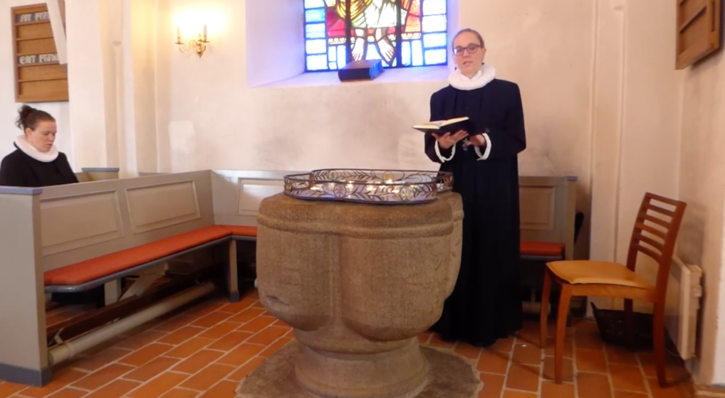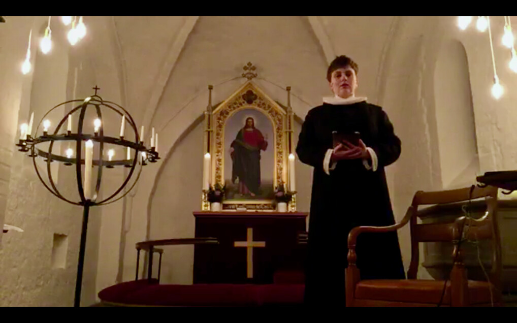 Lystænding, fadervor, en salme. Gabrielle Nilausen, Barbara Jensen og Finn Bruno Edvardsen fra Valby Kirke i Helsinge holder andagt på Youtube. Uden andet personale af hensyn til smitterisikoen