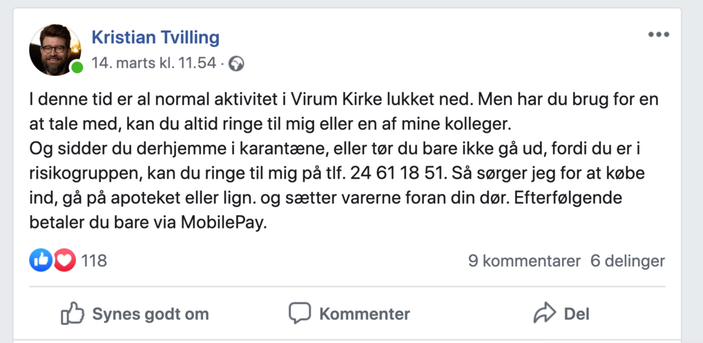 Kirkerne må ikke holde gudstjenester og ikke engang åbne dørene, så folk kan komme ind og tænde et lys. Præsterne kan ikke mødes med konfirmanderne eller gå på hjemmebesøg. Heldigvis blomstrer ideerne over hele stiftet til, hvordan man så bærer sig ad med at nå ud til både den faste menighed og de andre i sognet, der kunne have brug for kirken i en ekstraordinær tid.
