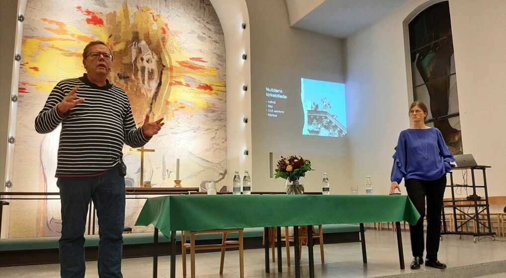 Aftenens to oplægsholdere var Peter Lodberg, professor på systematisk teologi i Aarhus, og Karen Marie Leth-Nissen, projektmedarbejder ved Folkekirkens Uddannelses- og Videnscenter. Foto: Karina Juhl Kande.