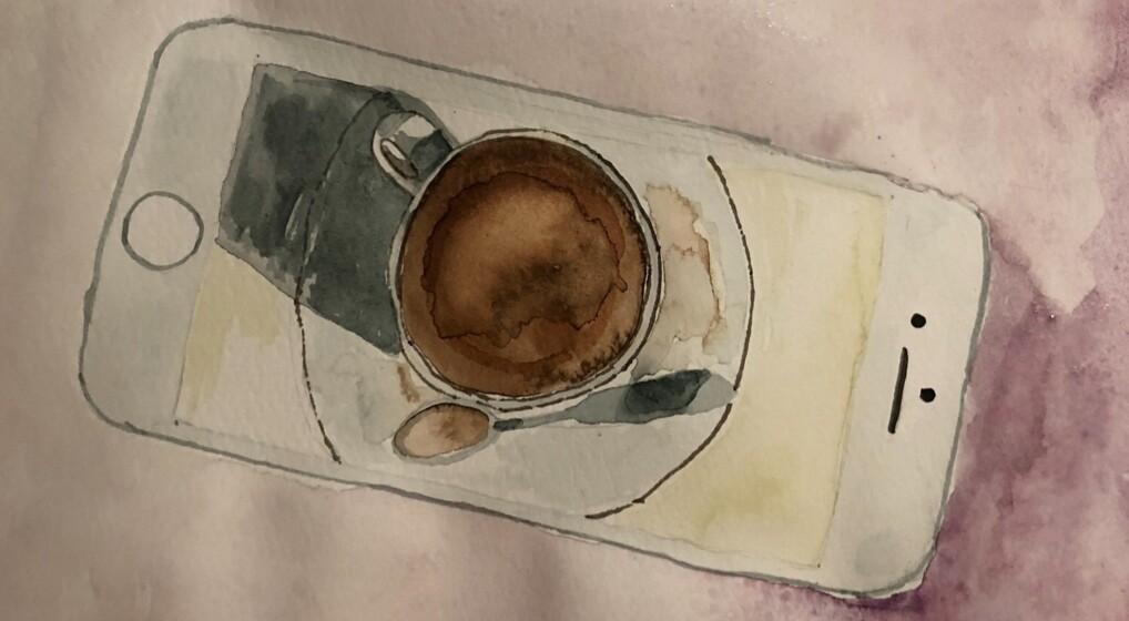 Telefonen og kaffekoppen har været vigtige redskaber for kirkerne gennem hele coronaperioden. Her malet af diakonikonsulentens datter, Katrine Muff Enevoldsen.