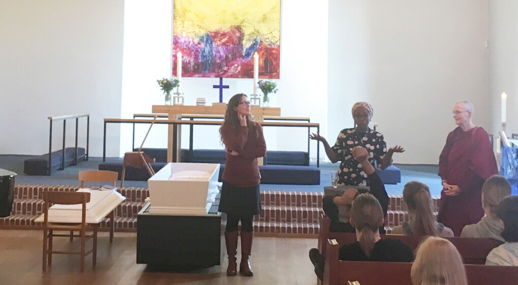 Tre religiøse repræsentanter mødes med gymnasieelever i den lokale folkekirke under overskriften: ”R.I.P. – ritualer i forbindelse med døden”. Sognepræst Rachel Wille Christophersen, Imam Fatima Osborne og Buddhistisk nonne Tenzin Drolkar.