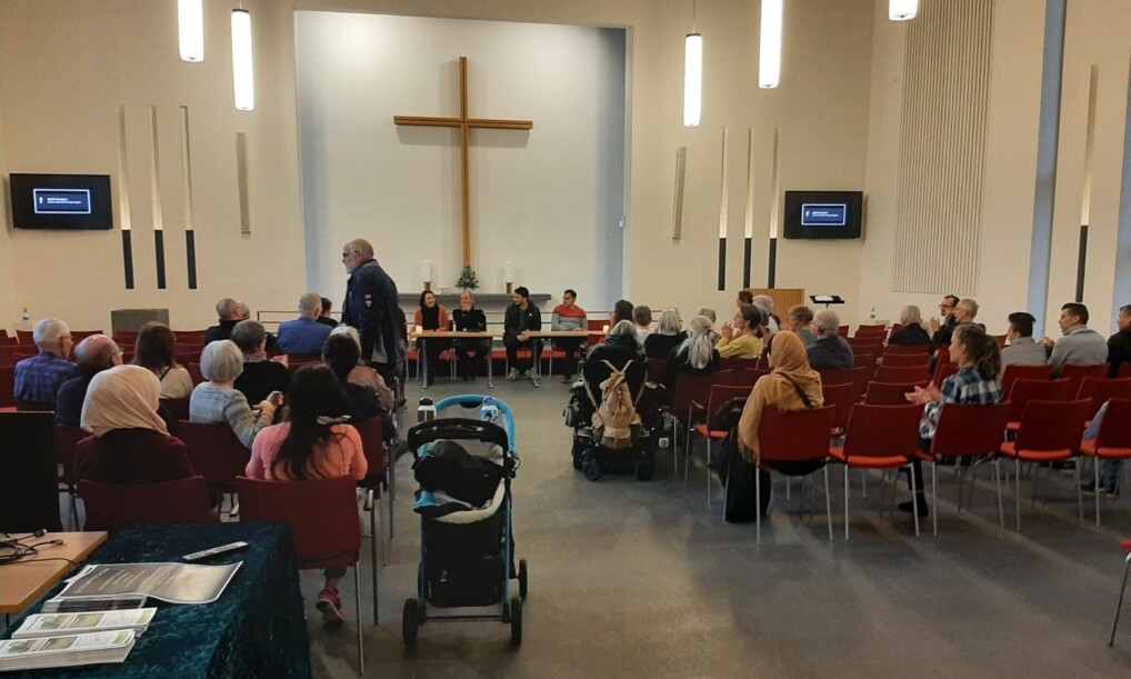 Både nydanskere og 'gammeldanskere' mødte talstærkt op, da Grønnevang Kirke holdt naboaften med fokus på syriske flygtninges fortællinger. Foto: Thyge Enevoldsen.