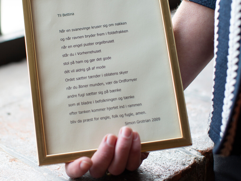 Jeg afslutter mit teologistudium med et speciale, der handler om at tage håbet fra mennesker, som er uhelbredeligt syge. Det lyder underligt bagvendt, det er ikke desto mindre en praksis, som en sygehuspræst gør brug af. Jeg beslutter at analysere denne praksis vha. Søren Kierkegaard. Efterfølgende møder jeg præsten, og han tager mig under sine vinger. Jeg indleder min præstegerning med at være sygehuspræst, og han giver mig det indrammede digt ved min ordination. Han har fået Simon Grotrian til at skrive et digt tilegnet mig. Både den gestus og selve digtet er meget smukt, synes jeg. Hjemme hos mig hænger det lige ved mit skrivebord, og den gyldne ramme husker mig altid på, at Guds evighed også omgiver vores liv. Nu kan andre også læse digtet.