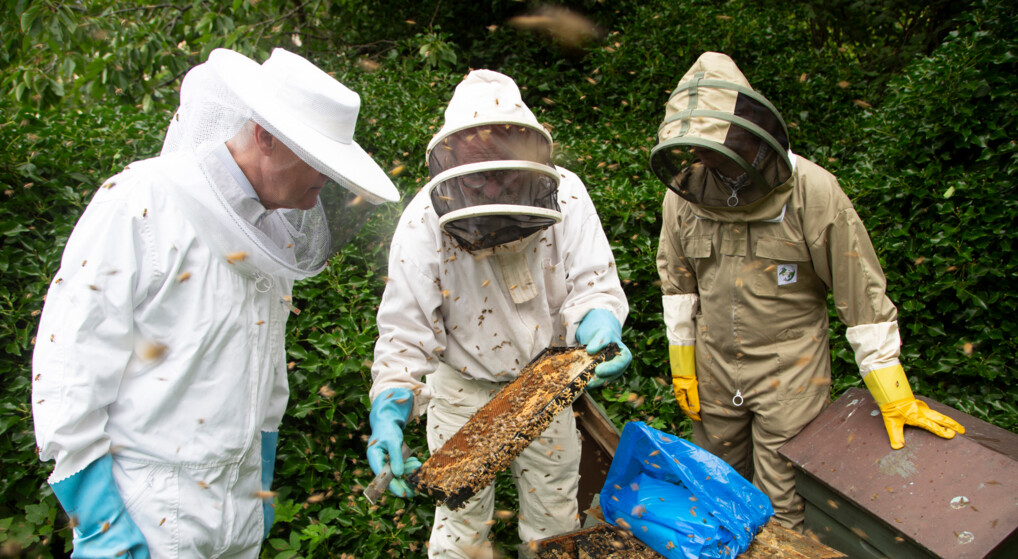 Biskop Peter Birch, præst i Sct. Mariæ Kirke Sigurd Stubbergaard og biavler Nikolaj Wium besigtiger bistaderne i stiftshaven.