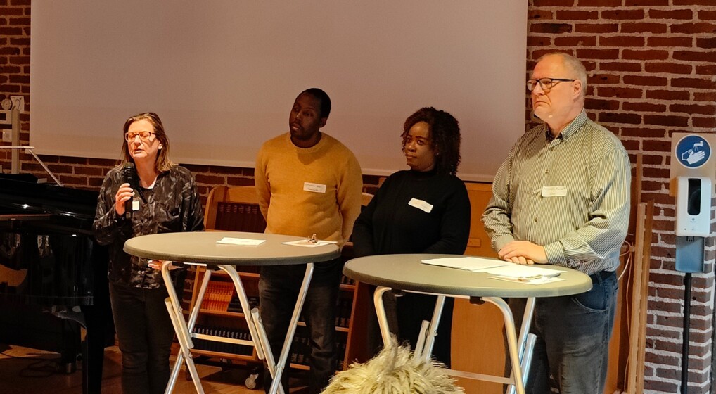 De tre paneldeltagere gjorde konferencedeltagerne klogere på de udfordringer og glæder, der opstår for nydanskere i mødet med folkekirken. Fra venstre er det Joy Eastwood, Wamwati Karuri, Joy Kagende Okoye og Michal Rønne Rasmussen, der ledte samtalen.