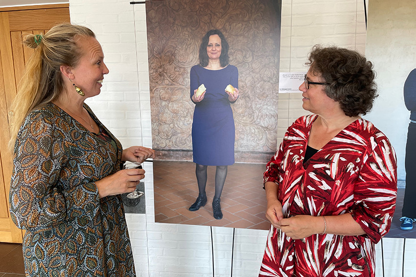 Asta Gyldenkærne (th.) er sognepræst ved Kirkerne i Ishøj, hvor udstillingen har været opstillet i efteråret. Her sammen med fotograf Sille Arendt ved åbning af udstillingen i Vejleå Kirke.