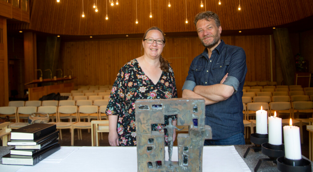 Mette Dansøn og Morten Poulsen ved altret i Vestervang Kirke med bagsiden af kirkens Kristus figur, som også dekorerer bagsiden af salmebogen. Foto: Sille Arendt
