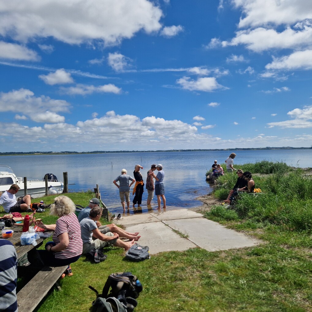 Vi starter med en lille meditativ andagt, langsomhed er i centrum, det er ikke nemt mærker jeg, som var til koncert med "Minds of 99" i går aftes. Og langsomhed står i kontrast til hverdagen med al dens planlægning og hurtige skift imellem opgaver og mennesker, altid holde øje med tiden. Der er meget, som banker på i stilheden. Vi sidder med lukkede øjne, mens jeg læser ordene om langsomhed og det lille bibelsted i relation hertil. Til hvert ord knytter sig et bibelsted. Det indrammer os. Hver dag går vi den samme pilgrimsvandring fra Draaby Kirke om morgenen og til Gerlev Kirke om eftermiddagen og så tilbage til Draaby Kirke igen. En vidunderlig smuk rute langs fjorde og igennem skove.