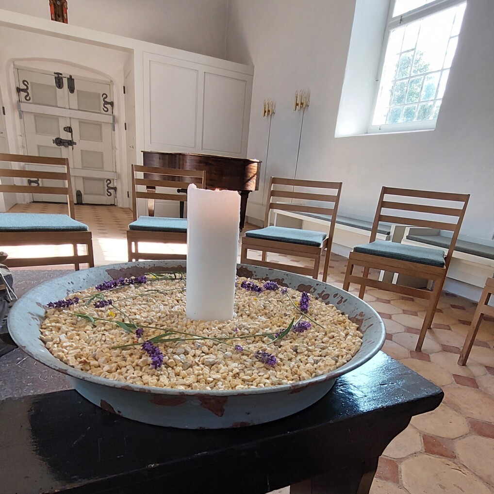 Flere og flere mennesker dukker op, jeg henter ekstra stole, nu er vi 22. Vi sidder i en rundkreds med et stort bloklys i midten. Draaby Kirkes sideskib er et smukt rum, hvidt og roligt med store gamle vinduer ud til kirkegården. Jeg lukker dørene, både den inderste og den yderste, det er blevet en tid til stilhed.