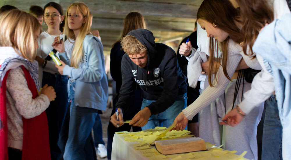 Konfirmander samarbejder om at fylde en beholder med vand, med små skåle lavet af papir. Foto: Sille Arendt, Konfirmandevent 2023