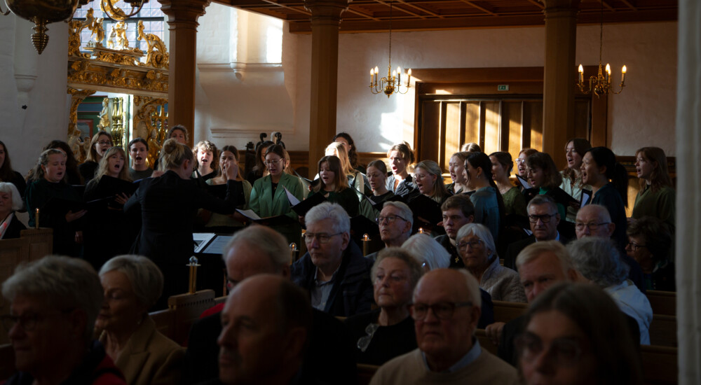 synger forsamlingen med en volumen, der næsten får domkirkens kobbertag til at lette. Både Domkoret og Stiftskoret Vokalensemblet Suona sørger desuden for, at øregangene forkæles, og provst Marianne Telling indtager prædikestolen for at holde årets landemodeprædiken.