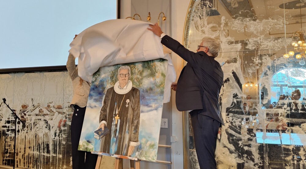 Domprovst Eva Tøjner er igen på talerstolen for at præsentere dagens allersidste programpunkt: Afsløringen af det nye bispeportræt, som billedkunstner Maria Wandel, der er uddannet fra Det Kongelige Danske Kunstakademi, står bag. Det er en tradition i alle folkekirkens stifter, at kirkens biskopper portrætteres, og nu skal portrættet af Helsingør Stifts fjerde biskop altså afsløres.