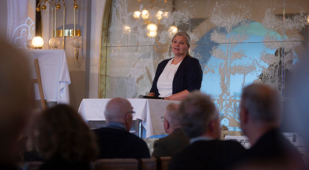 ”Tænk at få lov til at være et menneske, blandt andre mennesker. Ikke skulle strække kræfter og ansvar længere, end det er muligt. Ikke skulle forsøge at tage ansvar for det, vi alligevel ikke er ansvarlige for. Lade Gud bære med på det, der er hans ansvar,” lyder det ud over forsamlingen.