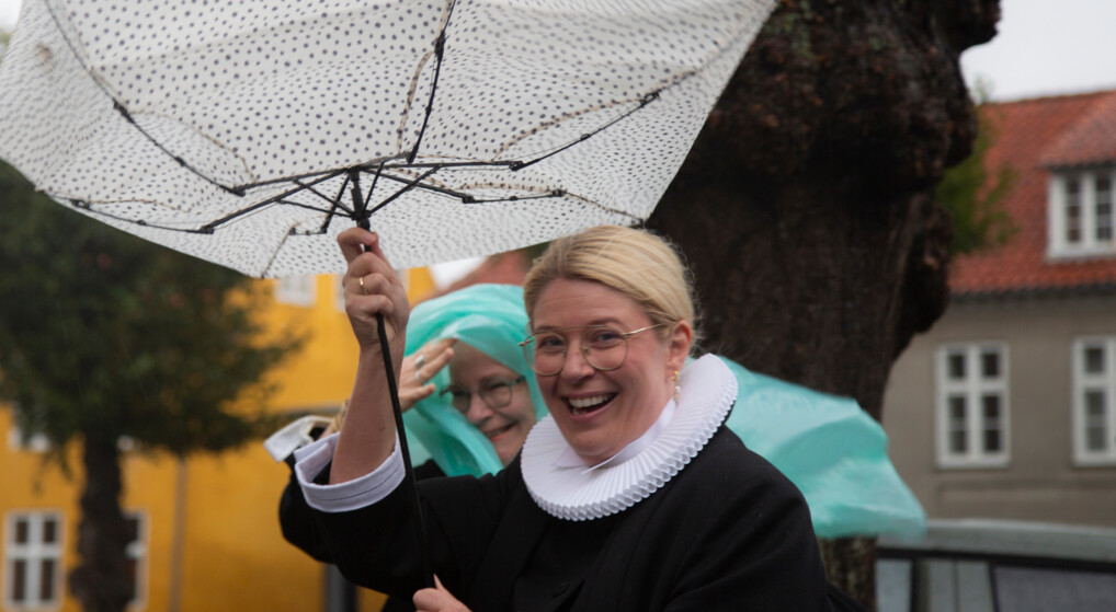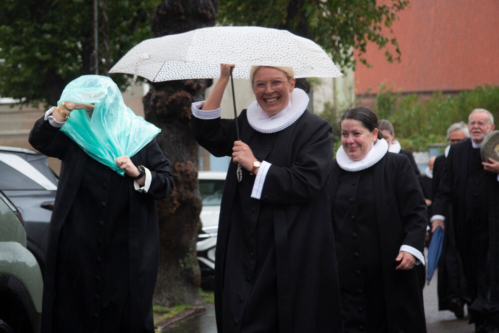 Øresund er dækket af hvide skumtoppe, og gaderne i Helsingør klædt i vandpytter og nedfaldne grene og teglsten, da klokkerne i Domkirken ringer ind til årets landemodegudstjeneste. Trods massiv regn og rusk har flere end 350 mennesker udstyret med farverige regnslag og drilske paraplyer fundet vej til Domkirken. I ly for oktoberstormen Amy hilser de pænt på hinanden inde i kirken og finder sig til rette på bænkene.