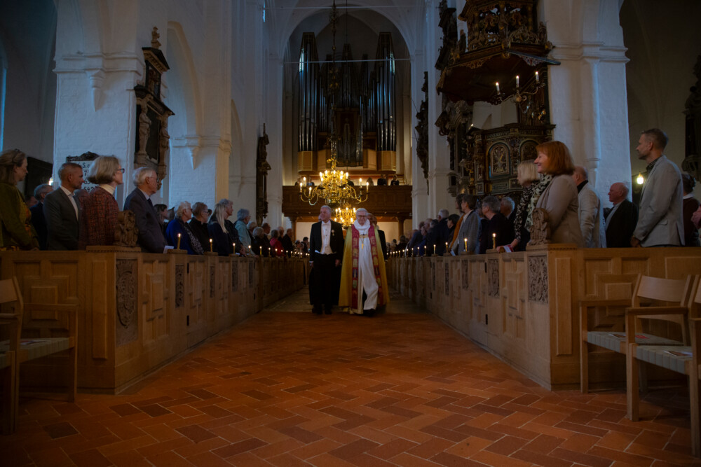 Måske er det verdenssituationen. Måske er det vejret. Måske er det en blanding. Men med sin prædiken formår Sophie Juel at skabe et rum for eftertænksomhed. Et rum hvor tiden står stille, og ordene og deres alvor synker ind i en stilhed, der kun afbrydes af de svajende træer, der kan skues i horisonten gennem Domkirkens store sprossede vinduer.