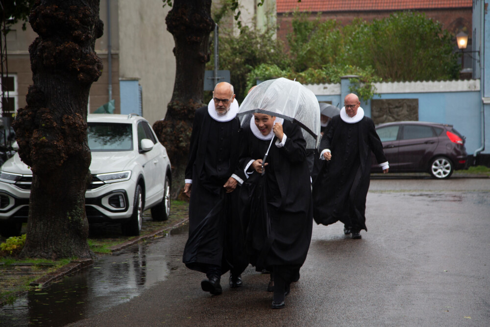 Vejret spænder ben for, at provster og præster med biskop Peter Birch og stiftamtmand Henrik Horster i front kan gå i procession foran Domkirken, så i stedet går ruten op og ned ad Domkirkens lange gange.